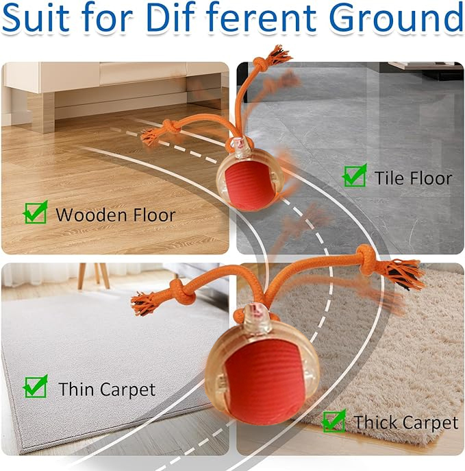🐱Self-Rotating Smart Ball: Our innovative smart ball features a powerful drive that enables 360° rapid rolling on various surfaces including tile, marble, wood floors, and thin carpets. The ball intelligently changes direction upon encountering obstacles for uninterrupted play.