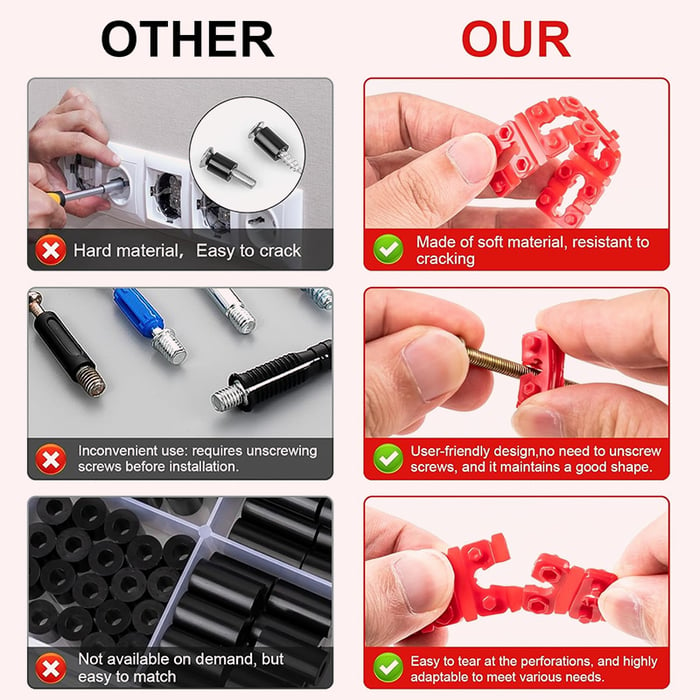Easy to Install: You only need a screwdriver to remove the outlet you want to repair, then stack the electrical box spacers to the desired thickness, insert them behind the screw, and tighten the screw. It is more convenient and environmentally friendly to use than traditional cylindrical electrical outlet spacer and does not cause waste.